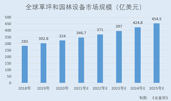 根據(jù)全球市場研究公司(Global Market Insights, Inc.)統(tǒng)計數(shù)據(jù),2018-2020年,全球草坪和園林設(shè)備市場規(guī)模分別為283億美元、302.8億美元、324億美元,預計至2025年將超過450億美元。