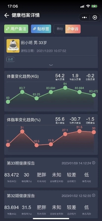 宅客科技首創(chuàng)健康檔案對比分析功能,完整記錄了會員的各項身體參數(shù)的變化趨勢,便于教練更好對比訓(xùn)練服務(wù)成果。每一次的測量記錄清晰可見,對于學員來說,可以直接看到自己通過訓(xùn)練后,身體是否有變化,很直觀的感受自己的投入值不值;對于場館而言,可根據(jù)歷史大數(shù)據(jù)開發(fā)更有針對性的訓(xùn)練課程以及提供更好的運營思路。