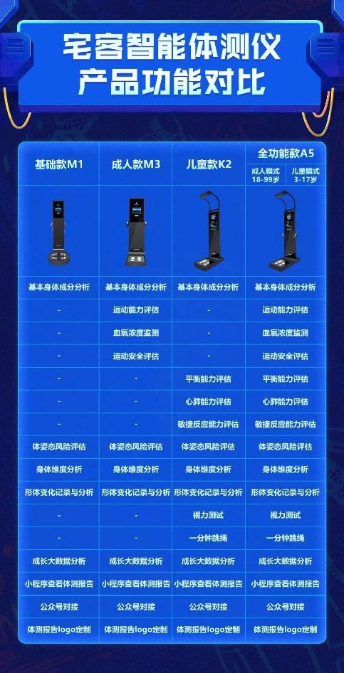 市面上的體測設(shè)備大多不具備評估人體是否可進行運動安全隱患的能力。以宅客智能體測儀A5為例,除了能測量身高體重基礎(chǔ)體成分外,還能測量血壓、心率、血氧,防止高強度運動所面臨的心肺功能風險,如心臟猝死、呼吸肌功能下降等,防止運動傷害。還可以評估身體最 大心肺功能、最 大攝氧能力等。教練根據(jù)測量結(jié)果,給予受測者精準、安全、有效的運動處方及運動建議,增強運動健身的安全性、科學性和有效性。