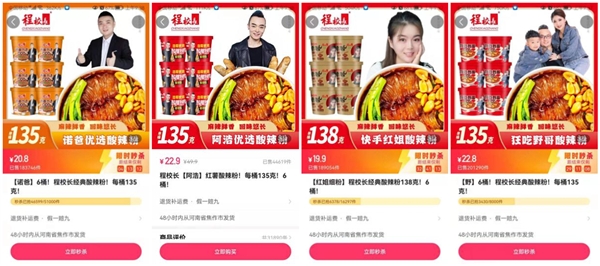 在現(xiàn)如今的網(wǎng)絡(luò)電商大環(huán)境下,網(wǎng)絡(luò)購(gòu)物已經(jīng)成為了當(dāng)下時(shí)尚的消費(fèi)模式。為了讓更多的客戶可以體驗(yàn)到品質(zhì)更好的產(chǎn)品,“程校長(zhǎng)酸辣粉”特與各大電商帶貨平臺(tái)的數(shù)位千萬(wàn)級(jí)帶貨網(wǎng)紅合作。