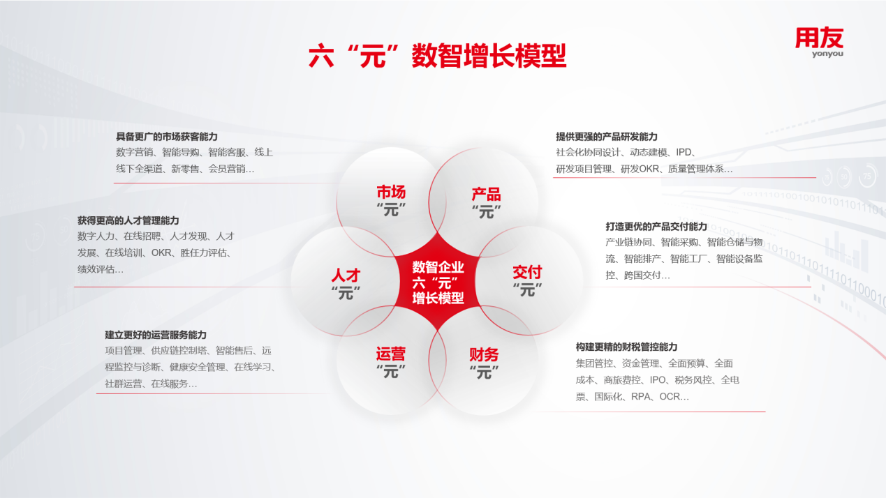 用友六“元”數(shù)智增長模型“應(yīng)運而生”,這個“元”既是數(shù)智化時代企業(yè)管理與業(yè)務(wù)的基本場景組合,也是經(jīng)營的基礎(chǔ)出發(fā)點和關(guān)鍵要素。