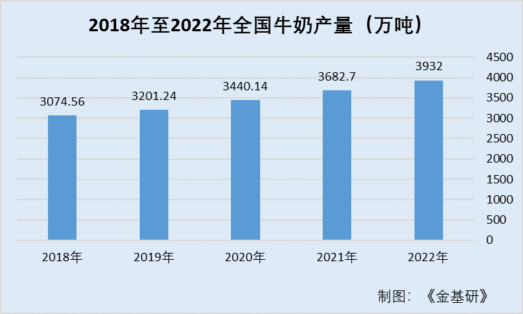 隨著近年來下游需求的持續(xù)增長(zhǎng)以及國(guó)內(nèi)奶牛養(yǎng)殖規(guī)?;M(jìn)程的持續(xù)推進(jìn),國(guó)內(nèi)牛奶產(chǎn)量也隨之逐年增長(zhǎng)。據(jù)國(guó)家統(tǒng)計(jì)局?jǐn)?shù)據(jù),2018年,全國(guó)牛奶產(chǎn)量已超3,000萬噸產(chǎn)量。2018年至2022年間,全國(guó)牛奶產(chǎn)量分別為3074.56萬噸、3201.24萬噸、3440.14萬噸、3682.7萬噸、3932萬噸,年產(chǎn)量增長(zhǎng)率分別為4.1%、7.5%、7.1%、6.8%。可以看出,國(guó)內(nèi)牛奶生產(chǎn)增速平穩(wěn),牛奶產(chǎn)量逐年穩(wěn)步提升,這為乳制品產(chǎn)量穩(wěn)定增長(zhǎng)奠定了基礎(chǔ),同時(shí)也是乳制品價(jià)格的穩(wěn)定的保障。
