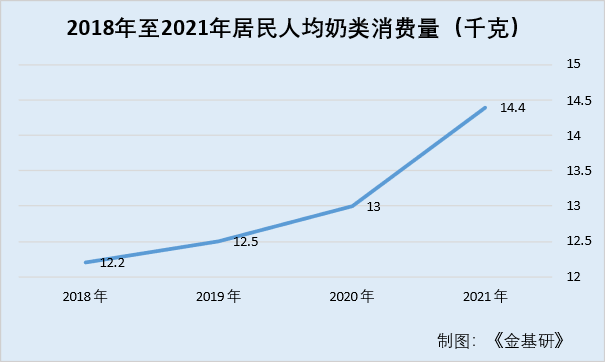 從消費(fèi)量情況來看,隨著人們對(duì)健康飲食的重視及全球乳制品產(chǎn)業(yè)的快速發(fā)展,促進(jìn)了人們牛奶需求量的增長(zhǎng),對(duì)牛奶消費(fèi)量也隨之不斷增加。據(jù)國(guó)家統(tǒng)計(jì)局?jǐn)?shù)據(jù),2018年至2021年居民人均奶類消費(fèi)量分別為12.2千克、12.5千克、13千克、14.4千克,從圖形上看,居民人均奶類消費(fèi)量呈加速增長(zhǎng)趨勢(shì)。