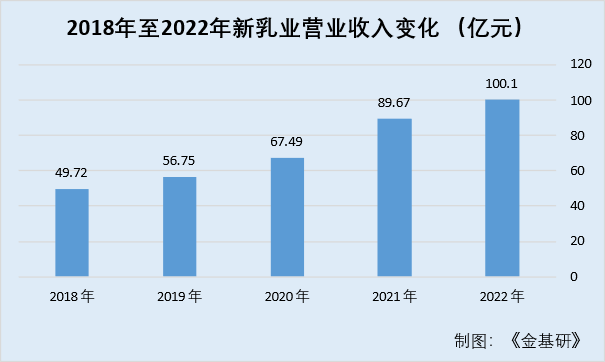據(jù)東方財(cái)富數(shù)據(jù),從營(yíng)業(yè)收入的總額上看,2018至2022年,新乳業(yè)的營(yíng)業(yè)收入逐年上升,這5年內(nèi)其營(yíng)業(yè)收入分別為49.72億元、56.75億元、67.49億元、89.67億元、100.1億元。