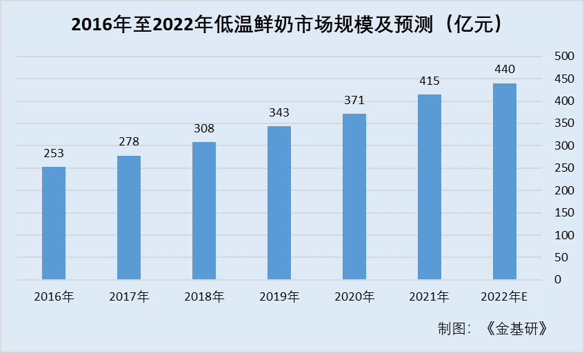 據(jù)中商產(chǎn)業(yè)研究院數(shù)據(jù),2017年,低溫鮮奶市場(chǎng)規(guī)模達(dá)到278億元,同比增長(zhǎng)達(dá)9.9%。2018年,低溫鮮奶市場(chǎng)規(guī)模再創(chuàng)新高,達(dá)到308億元,同比增長(zhǎng)超過10%。2019年,低溫鮮奶市場(chǎng)規(guī)模達(dá)到343億元,同比增長(zhǎng)11.4%。2020年,低溫鮮奶市場(chǎng)的增長(zhǎng)速度受到一定影響,但依然保持了增長(zhǎng)態(tài)勢(shì),全年市場(chǎng)規(guī)模達(dá)到371億元,同比增長(zhǎng)超過8%。2021年,低溫鮮奶市場(chǎng)規(guī)模再次突飛猛進(jìn),同比增長(zhǎng)達(dá)12%。國(guó)內(nèi)低溫鮮奶市場(chǎng)規(guī)模不斷提高,由2016年的253億元增長(zhǎng)至2021年的415億元,復(fù)合年均增長(zhǎng)率為10.4%。預(yù)計(jì)2022年低溫鮮奶市場(chǎng)規(guī)模將達(dá)440億元。