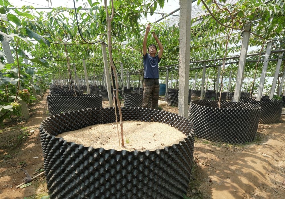 6月5日,盧龍縣木井鎮(zhèn)一名農(nóng)民在大棚內(nèi)管護(hù)即將成熟的葡萄。新華社記者 楊世堯 攝