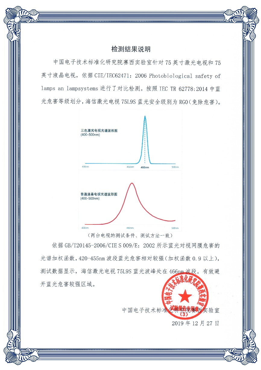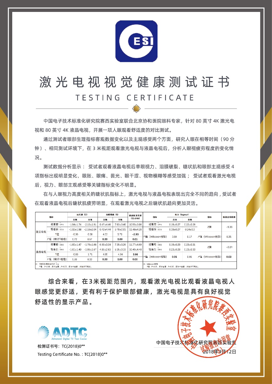 國家直屬權(quán) 威檢測機(jī)構(gòu)中國電子技術(shù)標(biāo)準(zhǔn)化研究院賽西實(shí)驗(yàn)室和北京協(xié)和醫(yī)院眼科專家,通過人群相同條件下觀看激光電視和液晶電視的嚴(yán)格對比試驗(yàn),測試數(shù)據(jù)分析顯示:受試者觀看液晶電視后單眼視力、淚膜破裂、睫狀肌和眼部主觀感受4項指標(biāo)出現(xiàn)明顯變化,眼脹、眼痛、畏光、眼干澀、視物模糊等感受加強(qiáng);受試者觀看激光電視后,視力、眼部主觀感受等關(guān)鍵指標(biāo)變化不明顯。研究發(fā)現(xiàn):在3米視距范圍內(nèi),觀看激光電視比觀看液晶電視人眼感覺更舒適,更有利于保護(hù)眼部健康,激光電視是具有良好視覺舒適性的顯示產(chǎn)品。