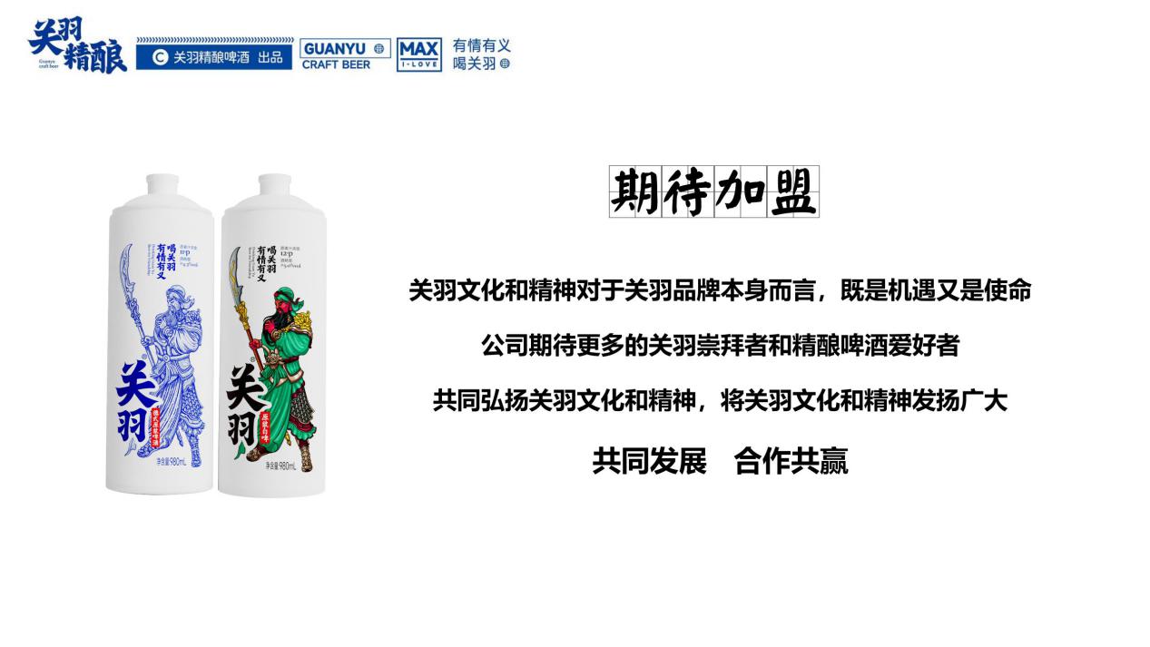 一起傾聽啤酒的故事,品嘗歷史與未來的交織!關(guān)羽精釀啤酒歡迎您的加 盟!作為招商伙伴,您將有機會:1. 銷售一款融合了傳統(tǒng)和創(chuàng)新,匠心獨具的產(chǎn)品。2. 加入到一個持續(xù)增長的市場,一起探索無限可能。3. 受益于關(guān)羽牌精釀啤酒品牌的力量和營銷支持,為您的業(yè)務(wù)增添亮點。期待與您一起舉杯慶祝這個全新的開始,共同描繪這個世界的多彩魅力,一同追求那份獨特的美好。有情有義,喝關(guān)羽!