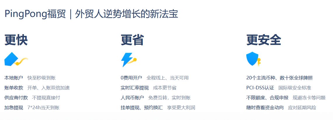 針對外貿企業(yè)依賴傳統(tǒng)外貿收付方式存在的開戶門檻高、收款到賬周期長、結匯成本高等問題,PingPong福貿通過布局建設全球收付服務網(wǎng)絡,并借助數(shù)字化技術整合多渠道收付通道資源于統(tǒng)一平臺,為廣大外貿企業(yè)提供了無需離岸公司,無需離岸賬戶,只需一個PingPong福貿賬號便可輕松收付全球市場的便利化服務。據(jù)悉,目前在PingPong福貿的一站式數(shù)字化平臺上,外貿企業(yè)可以0開戶費、0入賬費、0維護費的低成本開戶費用標準,使用17個全球收款賬戶和9大本地收款賬戶,快至秒級地收付阿聯(lián)酋、墨西哥、美國、香港、英國、歐洲、日本、韓國、印尼等多個主流市場及新興市場的外貿款項,并且無中間行手續(xù)費。同時,該平臺還支持外貿企業(yè)對超過20中主流幣種進行收款、付款、結匯、換匯,可高效全面地滿足外貿企業(yè)的全球收付全流程需求。