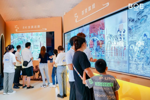 在“飛天敦煌”區(qū)域,京東方105英寸5K顯示大屏以21:9的電影級畫面效果完美展示敦煌供養(yǎng)人的人物細(xì)節(jié)。由多塊京東方畫屏組成的聯(lián)動(dòng)矩陣則展現(xiàn)了“飛天敦煌”的精彩群像,通過數(shù)字化演繹呈現(xiàn)出不同形態(tài)的飛天。BOE畫屏搭載無損Gamma、低藍(lán)光、無頻閃、防眩光、智能感光、圖像智能匹配等多種顯示技術(shù),具有類紙護(hù)眼顯示效果,可最大程度還原藝術(shù)作品的細(xì)節(jié),為參觀者展現(xiàn)出一個(gè)曼妙多姿的飛天世界。