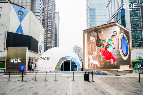 這是一個(gè)高7.6米、寬6米、長6米的巨大屏幕裝置,這個(gè)裝置的核心思想是“屏之物聯(lián)”,四面都采用了最新MLED技術(shù)的屏幕,中心燈光通道則營造出了一個(gè)虛擬與現(xiàn)實(shí)交融的空間。其由交互面和常態(tài)內(nèi)容播放面兩部分構(gòu)成。在交互面,參觀者通過交互臺觸摸并轉(zhuǎn)動(dòng)超維空間內(nèi)的數(shù)字地球時(shí),可以看到展現(xiàn)未來智慧城市、智慧出行和智慧生活的《萬象生活》,展現(xiàn)人類對宇宙探索和向往的《奇觀秘境》,展現(xiàn)科技與生態(tài)和諧共生的《未來生態(tài)》;在常態(tài)內(nèi)容播放面,觀眾可以看到將敦煌文化中九色鹿、飛天等元素栩栩如生呈現(xiàn)的《古今無界》,連接夢三國英雄與現(xiàn)實(shí)的《英雄夢界》,展現(xiàn)京東方30周年歷程及對未來期望的《Powered by BOE》。這個(gè)裝置不僅多角度地展示了京東方的“屏之物聯(lián)”戰(zhàn)略,還通過3D內(nèi)容的多樣性和與觀眾的互動(dòng),呈現(xiàn)了一場科技與藝術(shù)融合的視聽盛宴。