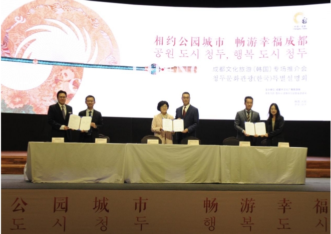 成都市文化廣電旅游局與大邱廣域市文化體育觀光局、成都傳媒集團(tuán)成都國(guó)際傳媒有限公司與韓國(guó)新傳媒集團(tuán)、成都傳媒集團(tuán)成都新聞國(guó)際旅行社有限公司與韓國(guó)模德旅游集團(tuán)分別簽訂了合作協(xié)議。本次簽約將持續(xù)加強(qiáng)兩市在文旅資源、旅游博覽會(huì)、旅游宣傳以及文化交流方面的合作。來自成都和韓國(guó)的傳媒集團(tuán)將會(huì)進(jìn)一步加強(qiáng)在文化傳媒以及東亞文化之都方面的交流合作,后續(xù)擬在韓國(guó)設(shè)立成都文化旅游推廣中心,在線上漫畫、電影、電視劇、綜藝節(jié)目等娛樂方面的內(nèi)容創(chuàng)作、傳播中,加強(qiáng)文化旅游領(lǐng)域的宣傳推廣合作。