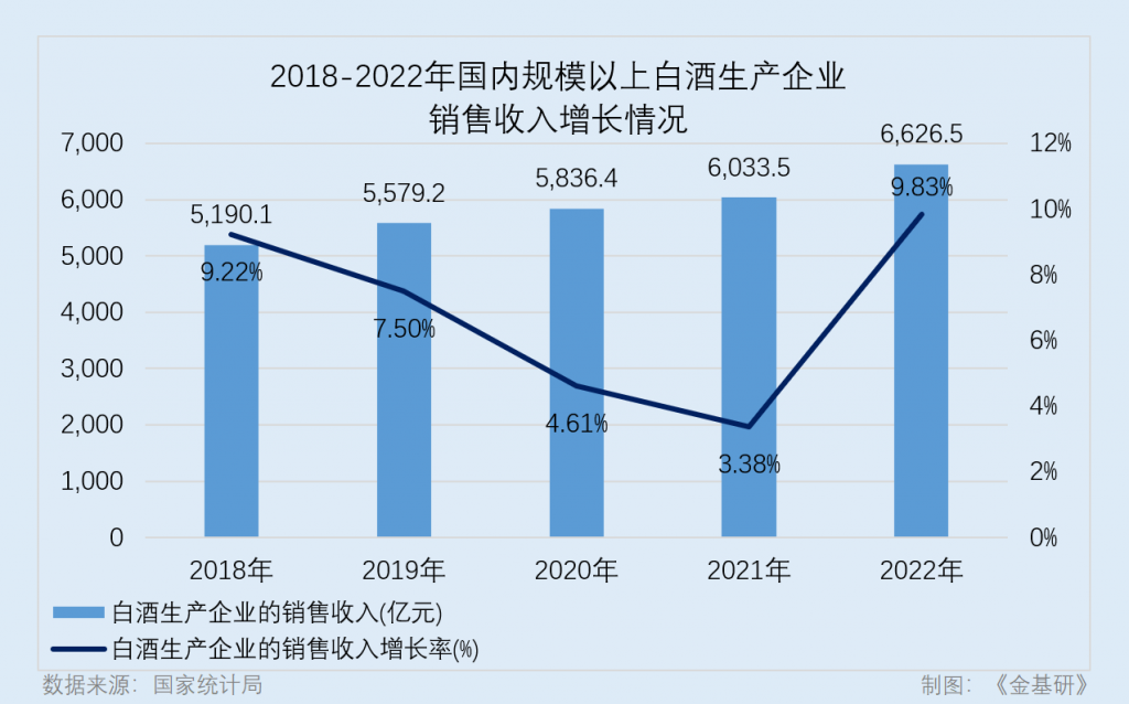 數(shù)據(jù)顯示,2018-2022年,國(guó)內(nèi)規(guī)模以上白酒生產(chǎn)企業(yè)的銷售收入分別為5,190.1億元、5,579.2億元、5,836.4億元、6,033.5億元、6,626.5億元,2022年規(guī)模以上白酒生產(chǎn)企業(yè)的銷售收入較同期增長(zhǎng)9.83%。