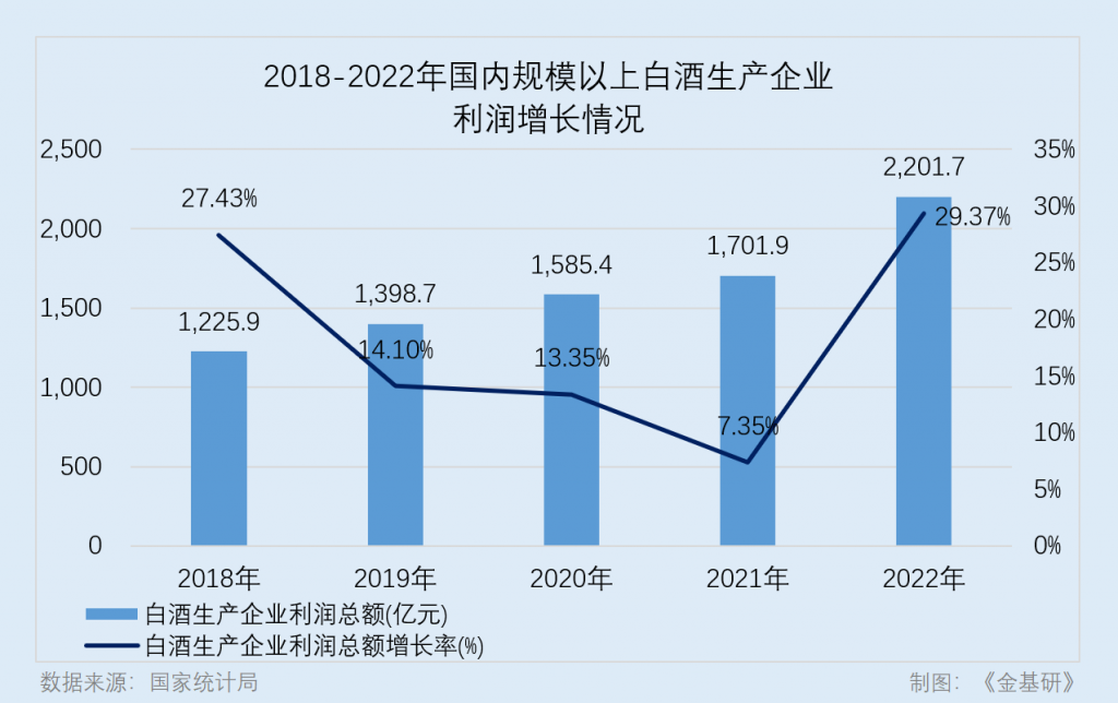 從利潤(rùn)的角度看,2018-2021年,國(guó)內(nèi)規(guī)模以上白酒生產(chǎn)企業(yè)的利潤(rùn)分別為1,225.9億元、1,398.7億元、1,585.4億元、1,701.9億元、2,201.7億元,2022年規(guī)模以上白酒生產(chǎn)企業(yè)的利潤(rùn)較2021年增長(zhǎng)29.37%。