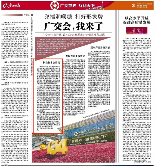 卡兒酷作為國(guó) 家級(jí)專精特新“小巨人”企業(yè)、國(guó)家高新技術(shù)企業(yè),在本次廣交會(huì)上受到新華社、中國(guó)國(guó)際電視臺(tái)(以下簡(jiǎn)稱CGTN)、廣東電視臺(tái)、廣州日?qǐng)?bào)、南方日?qǐng)?bào)、新華網(wǎng)、新京報(bào)等多家知名媒體邀約采訪。