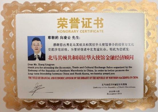 2023年12月23日,北馬其頓共和國特命全權(quán)大使奧利維爾·沙姆貝夫斯基(Oliver Shambevski, Ambassador Extraordinary and Plenipotentiary)代表北馬其頓共和國聘請(qǐng)旅美經(jīng)濟(jì)學(xué)家向凌云教授為北馬其頓共和國金融經(jīng)濟(jì)顧問。