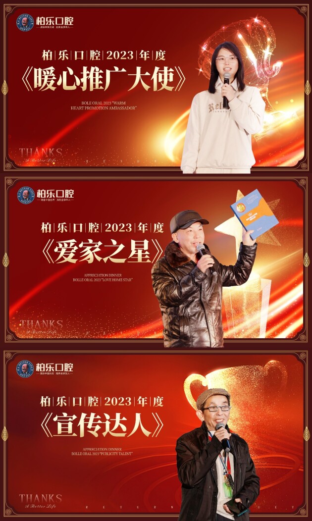 在柏樂(lè)口腔這幾年的發(fā)展中,共有50萬(wàn)+的客戶與柏樂(lè)一同前行。每一位客戶都值得柏樂(lè)去深深感謝,其中有幾位很特別的客戶讓他們的支持與信賴(lài)讓柏樂(lè)深受感動(dòng)與觸動(dòng)。這次柏樂(lè)專(zhuān)程將他們邀請(qǐng)到答謝會(huì)上,并給他們頒發(fā)了代表至高謝意的專(zhuān)屬定制獎(jiǎng)項(xiàng),這幾位品牌摯友都因?yàn)樽约涸诎貥?lè)看牙種牙而把這份信任傳遞與分享。他們有的把柏樂(lè)分享給了非常多的親朋好友、有的選擇把一家人都帶來(lái)了柏樂(lè)看牙、有的今年多次熱心出鏡為柏樂(lè)口腔宣傳,他們用自己真實(shí)的口腔變化與記錄感染和分享給了更多的人。他們是柏樂(lè)口腔前行的真摯動(dòng)力,柏樂(lè)口腔定將不負(fù)所望,繼續(xù)共同守護(hù)大家的口腔健康與幸福,不辜負(fù)任何一個(gè)客戶的信任。