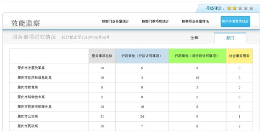 (4)事項(xiàng)辦理全程監(jiān)控:申請(qǐng)人可以對(duì)事項(xiàng)進(jìn)行網(wǎng)上咨詢、進(jìn)度查詢和結(jié)果查詢,并對(duì)服務(wù)進(jìn)行星級(jí)評(píng)定。監(jiān)察部門全程跟蹤,對(duì)逾期辦理的部門進(jìn)行警告和處理。
