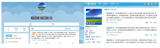 ?。?)"青海發(fā)布"微博。為滿足不同用戶獲取政府信息的需求,省政府門戶網(wǎng)站與受關(guān)注度較高,粉絲量較大的青海發(fā)布新浪微博和騰訊微博進行有效鏈接,使政府網(wǎng)站與微博平臺進行有效銜接,拓寬用戶信息獲取渠道。青海發(fā)布微博開通以來已發(fā)布三千多條微博信息,并積極開展微博問政等相關(guān)活動,當(dāng)前粉絲數(shù)已達到140多萬。積極回應(yīng)網(wǎng)民關(guān)切,為網(wǎng)民了解青海經(jīng)濟、政治、社會、文化和生態(tài)文明建設(shè)等開通便捷渠道。
