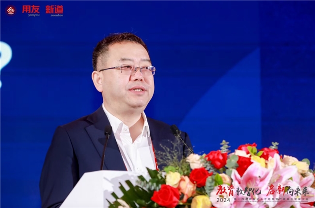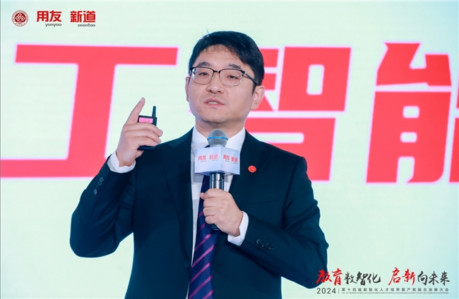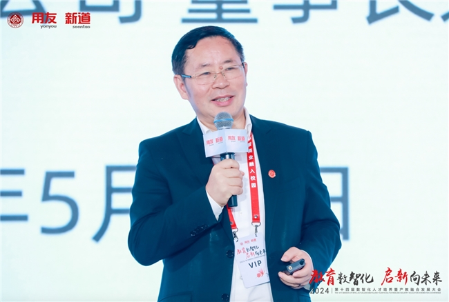 新道科技股份有限公司副總裁賈大明以“教育數(shù)智化 啟新向未來—新質(zhì)生產(chǎn)力時代下的產(chǎn)教融合新基建”為題作主題演講。他表示,發(fā)展數(shù)字經(jīng)濟就是發(fā)展新質(zhì)生產(chǎn)力,數(shù)智人才就是新質(zhì)人才,新質(zhì)人才特征是更懂硬科技、更懂?dāng)?shù)據(jù)、更懂產(chǎn)業(yè),培養(yǎng)新質(zhì)人才要圍繞能力構(gòu)建產(chǎn)教融合、運用科技構(gòu)建產(chǎn)教融合。賈大明介紹,新道科技以產(chǎn)業(yè)態(tài)勢感知平臺,聚焦人才供需適配;以產(chǎn)業(yè)鏈認知平臺,構(gòu)建產(chǎn)業(yè)全局思維;以企業(yè)認知實踐平臺,構(gòu)建企業(yè)全局思維;以商科專業(yè)創(chuàng)新平臺,構(gòu)建場景+、科技+、數(shù)據(jù)+;以工科專業(yè)創(chuàng)新平臺,構(gòu)建場景+、科技+、裝備+;以跨專業(yè)綜合實踐平臺,聚焦學(xué)科交叉綜訓(xùn);以能力訓(xùn)賽平臺,聚焦能力鑒定與競技;以數(shù)智科研平臺,助力教師科研創(chuàng)新;以產(chǎn)教融合大腦,聚焦產(chǎn)教資源平衡。賈大明表示,新道科技是產(chǎn)教融合戰(zhàn)略伙伴,能構(gòu)建用友生態(tài)全流程、多形態(tài)的閉環(huán)合作;是產(chǎn)教融合最佳伙伴,通產(chǎn)業(yè)、懂教育、富科技、有情懷;是產(chǎn)教融合務(wù)實伙伴和未來伙伴,圍繞人才培養(yǎng)的基本面開展落地行動。