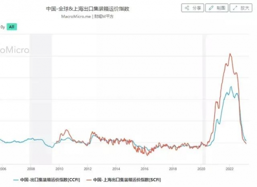 港口堆積成山,主要是因?yàn)樵谝咔槌跗谌肆?、運(yùn)輸、集裝箱等各方面資源緊缺,價(jià)格暴漲就導(dǎo)致供應(yīng)大量增加,集裝箱生產(chǎn)超平時(shí)的三倍,所以產(chǎn)能過剩、運(yùn)價(jià)暴漲等的情況出現(xiàn)也在意料之內(nèi)。從中國-全球&上海出口集裝箱運(yùn)價(jià)指數(shù)表內(nèi)就可以看到,自2022年開始,集裝箱的運(yùn)價(jià)就在垂直下降。