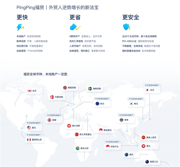 福貿(mào)是PingPong旗下的一站式外貿(mào)收款產(chǎn)品,支持近20個(gè)主流幣種的快捷收款,同時(shí)為外貿(mào)用戶提供本地收款賬戶,并且0開戶費(fèi)、0服務(wù)費(fèi)、0入賬費(fèi),方便境外買家進(jìn)行低成本的本地轉(zhuǎn)賬。
