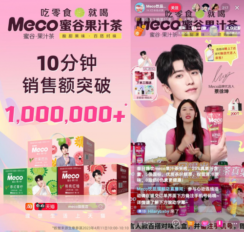 在蔡徐坤成為Meco蜜谷品牌新代言人消息發(fā)布后,僅10分鐘,在天貓Meco旗艦店,Meco x KUN八連杯禮盒銷售額就已經(jīng)突破了100萬。通過網(wǎng)友們的主動(dòng)傳播,將Meco蜜谷果汁茶產(chǎn)品迅速推廣開,獲得了一致好評(píng)。