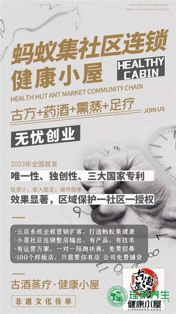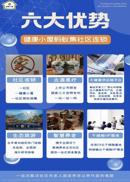 在大健康時(shí)代的力量推動(dòng)下,健康小屋與時(shí)俱進(jìn)、順勢(shì)而為,開(kāi)啟螞蟻集社區(qū)連鎖服務(wù)模式,集古酒蒸療、大健康供應(yīng)鏈平臺(tái)、生態(tài)旅游、智慧養(yǎng)老及干細(xì)胞VIP服務(wù)為一體,一站式解決社區(qū)內(nèi)老人居家養(yǎng)老健康難題。因此,縱觀整個(gè)市場(chǎng),健康小屋螞蟻集社區(qū)連鎖平臺(tái)的項(xiàng)目?jī)?yōu)勢(shì)顯而易見(jiàn),輕資產(chǎn),輕技術(shù),輕人工是眾多低成本投 資者的不二選擇。