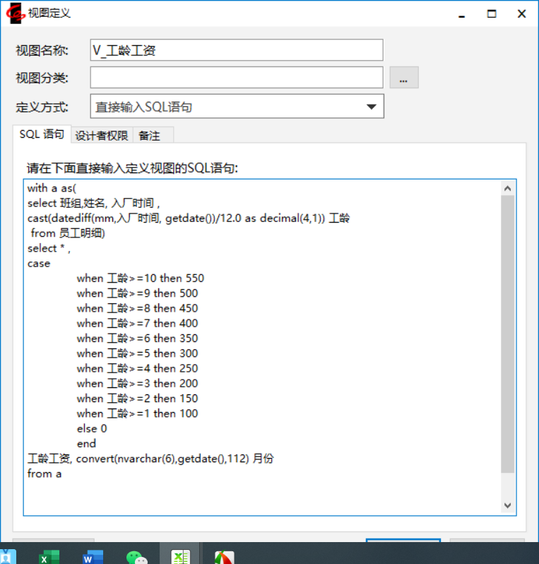 本案例單位為鼓勵熟練老員工留廠服務(wù),設(shè)有額外工齡工資,滿一年員工每月可享受100元工齡工資,每增加一年加50元,到550封頂。我們可以通過視圖關(guān)聯(lián)第 一步錄入在員工信息中的入廠時間自動計算當(dāng)前工齡工資。