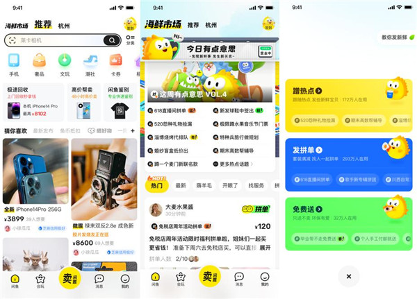 作為全新的全新社區(qū)化產(chǎn)品,海鮮市場位于閑魚首頁左滑Tab頁,提供了多維發(fā)布形態(tài),以激活更多交易新場景,讓用戶可以在海鮮市場輕松發(fā)布靈感,拓展閑置認知的深度廣度;用戶可以在這里參與包括社會熱點話題、興趣熱點話題、新物種和新副業(yè)、羊毛熱點話題等分類組織;通過趣味組局,海鮮市場還提供了包括拼單/交換/求購等新鮮有趣的交易方式及發(fā)布場景。由此帶來新鮮體驗的升級:如果說過去這種新鮮還只是少數(shù)人的樂趣,海鮮市場上線后,就變成了“獨新鮮,不如眾新鮮”了。