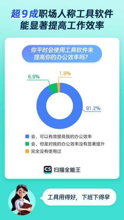 近期,合合信息旗下掃描全能王發(fā)布了《當代職場人辦公習慣洞察報告》(以下簡稱“《報告》”),對五百余位職場人士進行了辦公工具軟件使用習慣調(diào)研?!秷蟾妗凤@示,超9成的職場人會使用工具類軟件,并表示其能顯著提高工作效率。