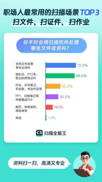 《報告》中還提到,職場人最常使用掃描軟件來掃描合同文件、發(fā)票等專業(yè)資料以及身份證、戶口本、營業(yè)執(zhí)照等證件。無論是給客戶發(fā)電子版文件,還是線上提交證件資料,用掃描代替直接拍照,不僅可以使文檔更高清可讀,也可以顯得更專業(yè),超過40%的受訪者選擇使用掃描全能王處理后發(fā)送,以獲得專業(yè)的掃描效果。