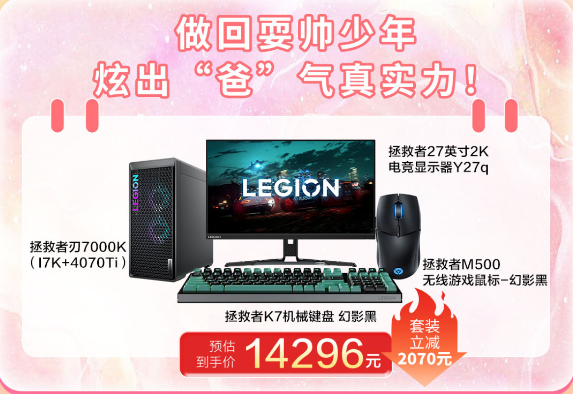 首先是拯救者系列超值游戲套裝,是父親節(jié)送禮首選。套裝包括性能王者拯救者刃7000K、超靈敏、手感超好的拯救者M(jìn)500無線游戲鼠標(biāo)、拯救者K7機(jī)械鍵盤,以及拯救者27英寸2K電競顯示器Y27q四件組合直降2070元,到手僅需14296元。