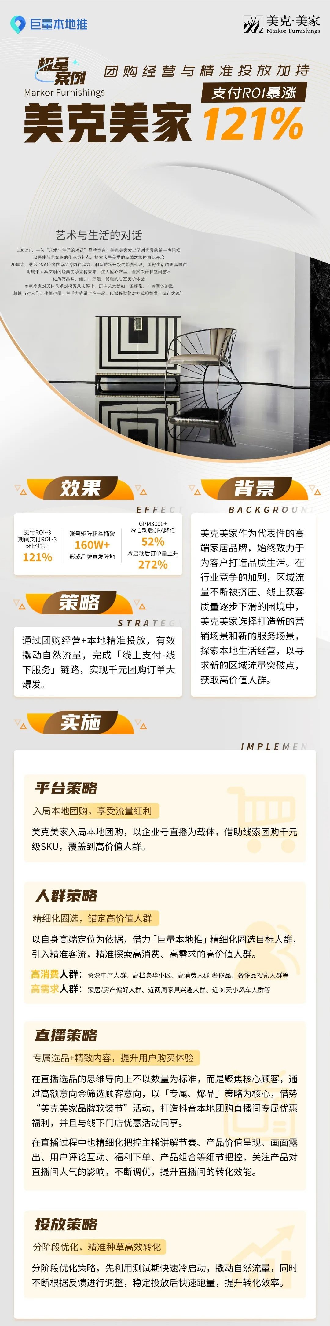 美克美家作為代表性的高端家居品牌,始終致力于為客戶打造品質(zhì)生活。在行業(yè)競(jìng)爭(zhēng)的加劇,區(qū)域流量不斷被擠壓、線上獲客質(zhì)量逐步下滑的困境中,美克美家選擇打造新的營銷場(chǎng)景和新的服務(wù)場(chǎng)景,探索本地生活經(jīng)營。在本地團(tuán)購中,美克美家借力「巨量本地推」引入精準(zhǔn)客流,有效撬動(dòng)自然流量,完成線上支付-線下服務(wù)鏈路,最終實(shí)現(xiàn)干元團(tuán)購訂單持續(xù)上漲,支付ROI提升121%,交出了一份滿意的答卷。