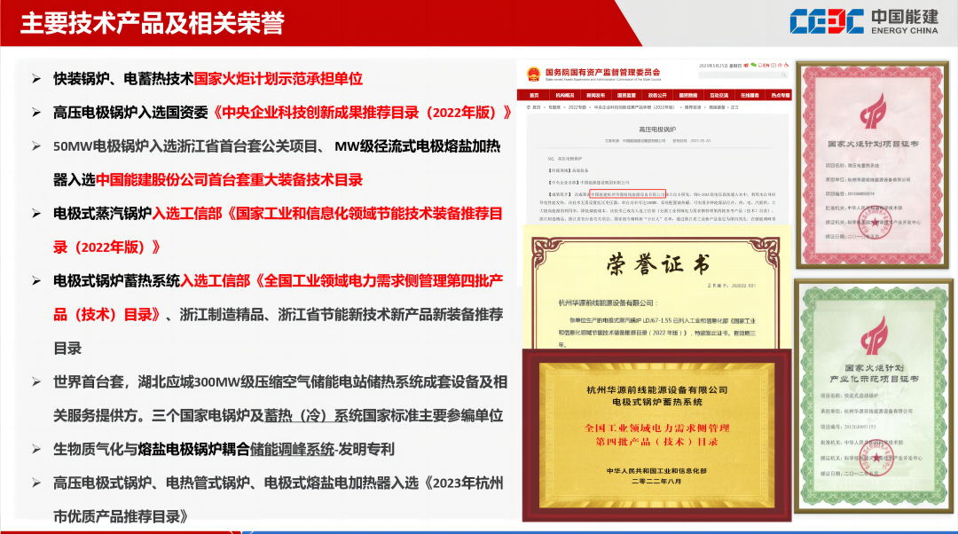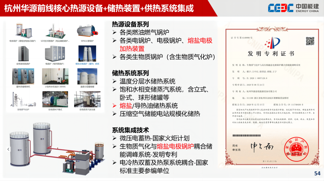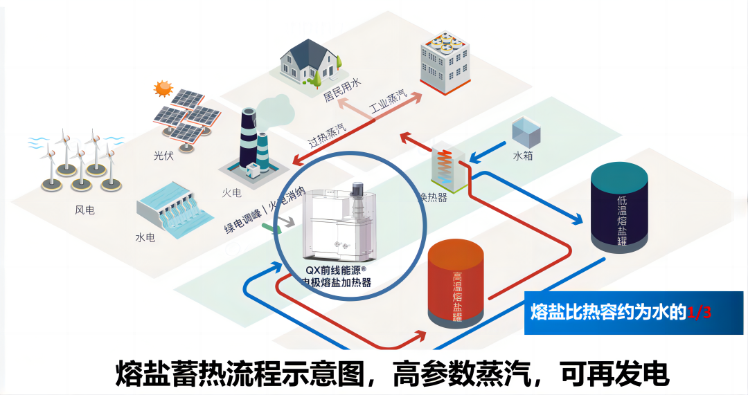 杭州華源前線“電極式熔鹽加熱及儲熱技術(shù)”,采用電極式熔鹽加熱爐與儲熱技術(shù)相結(jié)合的方式。電極式熔鹽加熱爐利用熔鹽高電導率特性,直接發(fā)熱,與常規(guī)電熱管加熱熔鹽形式比較,可實現(xiàn)10KV電直接接入,節(jié)省變壓器及低壓配電設(shè)備、單臺加熱功率大(可達50MW以上)、加熱溫度最 高可達600℃以上、占地面積小、耐腐蝕、效率高等優(yōu)點,再與我司儲熱技術(shù)相結(jié)合,可廣泛應(yīng)用于可再生能源消納、火電廠靈活性調(diào)峰改造等領(lǐng)域。目前該技術(shù)已于2022年8月完成研發(fā)中試,進入商業(yè)應(yīng)用階段。與會嘉賓、專家對我司采用電極式熔鹽加熱解決超高溫、大功率熔鹽電加熱難題,表示充分認可。眾多用戶單位、設(shè)計院表現(xiàn)出濃厚興趣,并在現(xiàn)場進行充分交流與探討。