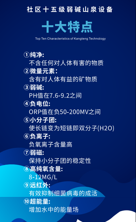 它是當(dāng)今世界水處理領(lǐng)域中理念和技術(shù)均優(yōu)秀的水處理設(shè)備。經(jīng)過這種先進(jìn)設(shè)備它所制出的水具有凈化、活化、礦化、磁化、微電解、負(fù)電位、負(fù)離子、遠(yuǎn)紅外、鍺鐳能量、超能等優(yōu)勢(shì)的小分子團(tuán)弱堿水。 經(jīng)檢測(cè),所制之水已達(dá)到或超過世界長(zhǎng)壽村之最高——加索長(zhǎng)壽村的標(biāo)準(zhǔn)。當(dāng)前市場(chǎng)上各種凈水器、純水機(jī)、磁化水機(jī)、活化水機(jī)、電解水(離子水)機(jī)等水處理設(shè)備其綜合性能均與“康騰神泉”牌超能弱堿山泉機(jī)無可比性。