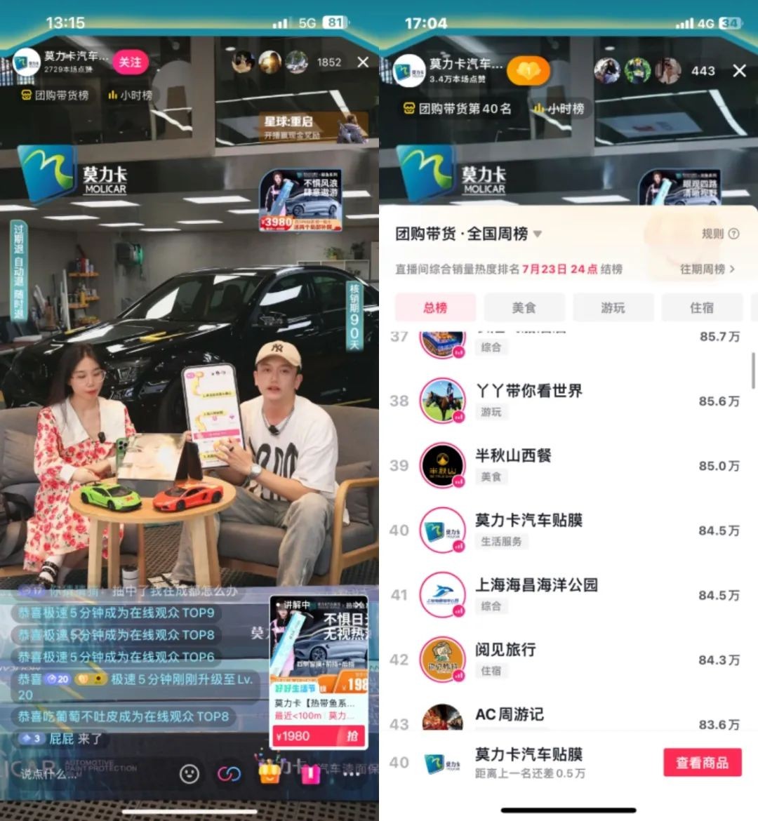莫力卡汽車貼膜入駐抖音平臺后,由于未進行精細化運營,缺少賬號內容積淀,用戶的留存率及轉化率不容樂觀。在此背景下,莫力卡汽車貼膜及時應用「巨量本地推」,精準聚焦本地目標用戶,打造抖音直播專場,創(chuàng)造了首場直播GMV超50萬、直播間在觀人數(shù)1900的里程碑式數(shù)據(jù)。憑借「巨量本地推」投流的精準力,莫力卡汽車貼膜實現(xiàn)了用戶心智與團品轉化的雙豐收。