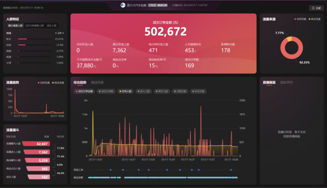 在整個直播過程中,恒樂影視使用了「巨量本地推」新功能“全域推廣”,在此作用下,莫力卡汽車貼膜直播間成交量成倍增長。另外,通過對直播節(jié)奏的把控,進行卡點投放,莫力卡汽車貼膜以觀看及成交TOP城市/地域為導向,對核心年齡段進行群體拓展,實現(xiàn)了低成本擴流和品宣。