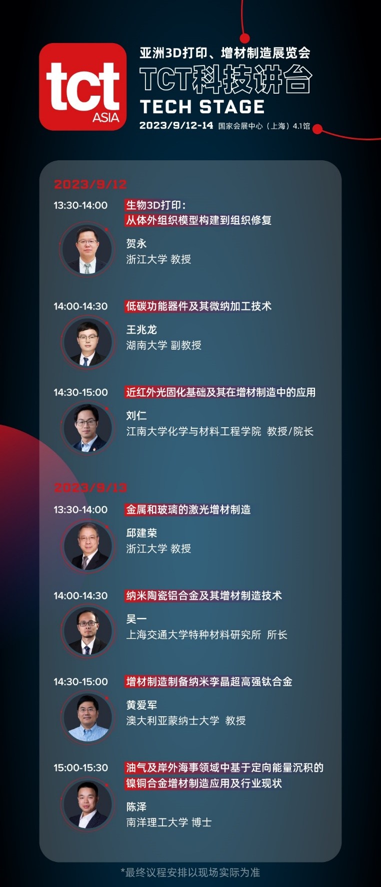 為了進(jìn)一步為增材制造技術(shù)發(fā)展注入“源頭活水”,推動(dòng)創(chuàng)新成果轉(zhuǎn)化與市場(chǎng)化的對(duì)接,TCT科技講臺(tái)邀請(qǐng)了國(guó)內(nèi)外眾多知名高等院校、研究院的專家學(xué)者、研究員等擔(dān)任演講者,其中包括浙江大學(xué)、上海交通大學(xué)、湖南大學(xué)、江南大學(xué)、新加坡南洋理工大學(xué)、澳大利亞蒙納士大學(xué)等。會(huì)議聚焦各個(gè)3D打印技術(shù)路線的研究進(jìn)展與突破,具體包括生物3D打印、微納3D打印、金屬與玻璃3D打印、陶瓷3D打印等,同時(shí)也關(guān)注3D材料的制備技術(shù)研究及其在各個(gè)領(lǐng)域的應(yīng)用潛力,例如增材制造制備納米孿晶超高強(qiáng)鈦合金,以及油氣及岸外海事領(lǐng)域中基于定向能量沉積的鎳銅合金增材制造應(yīng)用等。