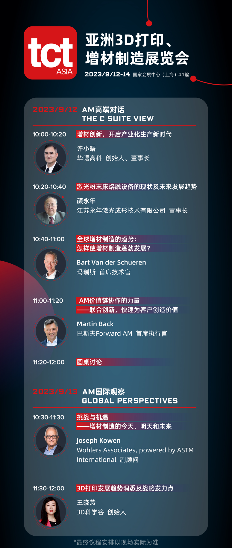 今年,主辦方特別策劃AM高端對(duì)話與AM國(guó)際觀察。其中,AM高端對(duì)話The C Suite View匯聚全球增材制造行業(yè)內(nèi)具有影響力的企業(yè)高管,華曙高科的許小曙博士,江蘇永年激光的顏永年教授,瑪瑞斯的Bart Van der Schueren先生,以及巴斯夫Forward AM的Martin Back先生。全新打造以洞悉3D打印行業(yè)趨勢(shì)、預(yù)測(cè)未來(lái)發(fā)展為著力點(diǎn)的AM國(guó)際觀察Global Perspectives邀請(qǐng)了來(lái)自Wohlers Associates, powered by ASTM International的Joseph Kowen先生,以及3D科學(xué)谷的創(chuàng)始人王曉燕女士,他們將從企業(yè)家角度,行業(yè)觀察者角度,深度剖析當(dāng)前行業(yè)的市場(chǎng)現(xiàn)狀、前景展望及發(fā)展對(duì)策。