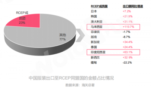 在政策端,因RCEP協(xié)議持續(xù)釋放紅利,東南亞、日韓等經(jīng)濟(jì)體需求強(qiáng)盛,中國(guó)服裝市場(chǎng)因地緣因素快速滲透。中國(guó)服裝出口至RCEP成員過(guò)的金額占整體服裝出口額約23%,同盟國(guó)中8個(gè)國(guó)家的出口額同比增速均有所不同程度的上漲。