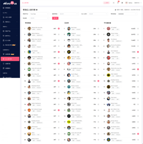 另外,報(bào)告還公開(kāi)了WotoHub海外網(wǎng)紅智能營(yíng)銷(xiāo)云基于千萬(wàn)海外紅人資源,對(duì)粉絲粘性高的中長(zhǎng)尾部紅人分別進(jìn)行帶貨數(shù)量、互動(dòng)率、播放量三個(gè)維度的排名。品牌在WotoHub內(nèi)還可在上方導(dǎo)航欄內(nèi)設(shè)置國(guó)家、紅人分類(lèi)、粉絲數(shù)多個(gè)篩選條件,以獲得更為精確的榜單排名,實(shí)現(xiàn)高效、精準(zhǔn)、低成本地鏈接海量帶貨紅人。