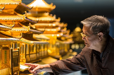 (上:花絲鑲嵌工藝大師姚迎春指導潮宏基“臻寶博物館”鎮(zhèn)館之寶“花絲風雨橋”設計制作;