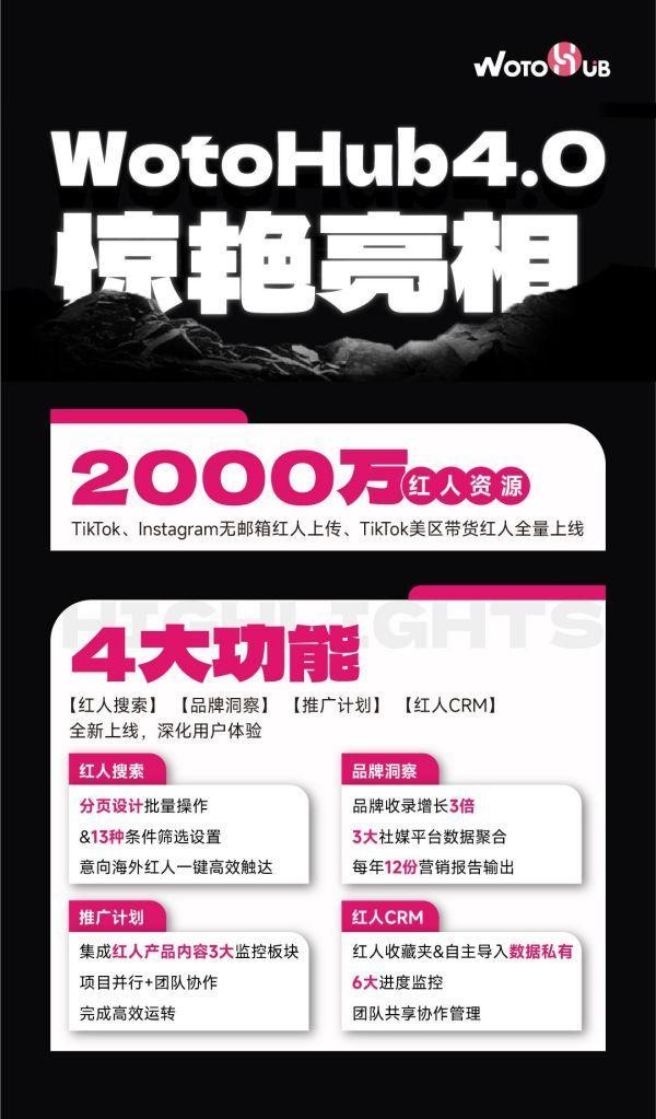 如果說(shuō)3.0版本更多地聚焦初涉紅人營(yíng)銷的賣家需求,那4.0版本則是站在紅人管理、團(tuán)隊(duì)協(xié)作、數(shù)據(jù)沉淀的角度去思考,為跨境賣家筑造健全的海外紅人營(yíng)銷體系。今天,就讓我們一同走進(jìn)新版WotoHub,揭開此次更迭的神秘面紗吧~