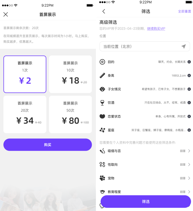 據(jù)了解,“BenBen”的提高人氣功能定價(jià)為2元/小時(shí)。通過此功能,用戶可以獲得更靠前的展示位,從而讓更多的人看到自己,增加曝光度和互動(dòng)性。這種模式對于“被動(dòng)型”的社交選手來說,無疑是一個(gè)極具吸引力的選擇。此外,“BenBen”還推出了高級篩選功能,定價(jià)為40元/月。付費(fèi)用戶可以解鎖星座、性格、性取向等11種篩選維度,本著“交友在精不在多”的原則,給用戶親手為新朋友制定“硬性標(biāo)準(zhǔn)”的機(jī)會(huì),大大提高了社交效率。
