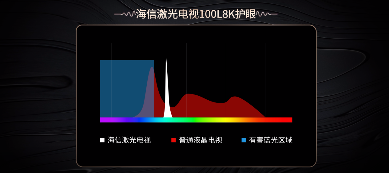 在這個離不開電子設備的時代,護眼已經成為全民關注的熱點話題。海信100英寸激光電視L8K采用純凈激光光源,避開有害藍光傷害最大的435-445nm波段,從源頭解決用戶最擔心的有害藍光問題。