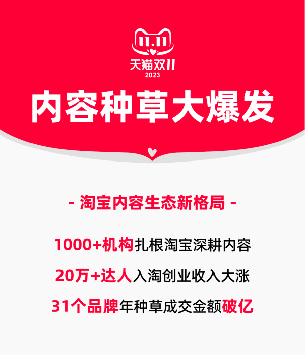 最 新數(shù)字顯示,今年已有超過20萬達人、1000家專業(yè)機構入駐淘寶。他們帶來真實有趣的內(nèi)容,吸引更多消費者在淘寶停留更長時間。雙11以來,淘寶短視頻觀看用戶同比增長142%,觀看時長同比增長439%,更多達人在淘寶抓住內(nèi)容化的紅利創(chuàng)業(yè),整體收入同比大漲7倍,同時已經(jīng)有31個品牌,在淘寶實現(xiàn)年種草成交金額過億。