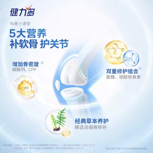 想要延長(zhǎng)關(guān)節(jié)“壽命”,就一定要養(yǎng)成良好的運(yùn)動(dòng)習(xí)慣,適度能夠促進(jìn)體內(nèi)的新陳代謝,調(diào)節(jié)體內(nèi)的激素平衡,維持身體健康,同時(shí)也要及時(shí)給關(guān)節(jié)補(bǔ)充營(yíng)養(yǎng)。其中氨基葡萄糖(以下簡(jiǎn)稱“氨糖”)是軟骨內(nèi)的重要組成成分,可以促進(jìn)軟骨細(xì)胞的生成。隨著年齡的增長(zhǎng),體內(nèi)的氨基葡萄糖含量越來(lái)越少,因此,適當(dāng)補(bǔ)充氨糖可以催生關(guān)節(jié)滑液、減少關(guān)節(jié)軟骨磨損、預(yù)防膝關(guān)節(jié)的退變。此外,適當(dāng)補(bǔ)鈣可以預(yù)防骨質(zhì)疏松,減緩鈣質(zhì)流失,有助于保護(hù)膝關(guān)節(jié)。當(dāng)然也可以多曬太陽(yáng),促進(jìn)鈣的吸收。而健力多氨糖軟骨素鈣片采用