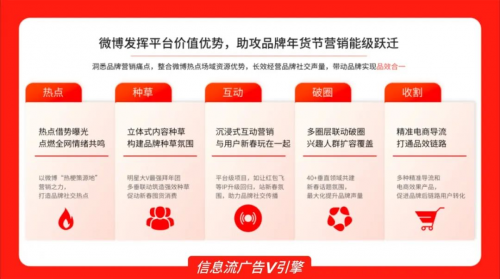 進入后疫情時代,2023年春節(jié)假期消費需求得到集中釋放,“在年貨節(jié)打一場勝仗”成為品牌商家最關心的問題。微博信息流廣告產(chǎn)品制定了“熱點——種草——互動——破圈——收割”的完整營銷流程,助力品效雙收。