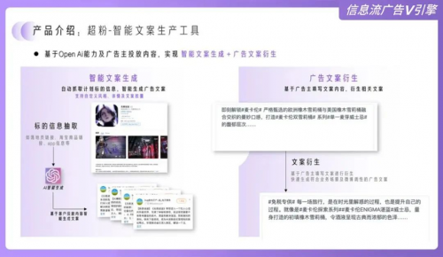 2023年是AIGC發(fā)展元年,大模型層出不窮,微博也在探索將AIGC應用到營銷行業(yè)。9月,微博超粉新版本上線后,廣告模型已實現(xiàn)對素材維度的識別與學習,基于廣告主投放內(nèi)容,支持“智能文案生成”和“廣告文案衍生”。